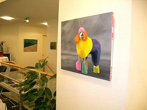 Die Bildwelt von Gertrud Schleising ist voller Überraschungen. Die Werke der aus Berlin stammenden Künstlerin sind figurativ, gegenständlich – aber die Zusammenstellung dieser Figuren und Gegenstände in ihren Bildern, Zeichnungen oder Objekte ist alles andere als realistisch: spielerisch wird aus einem Autoreifen eine kunstvolle Frisur, aus einem Auge ein Lampenschirm oder aus einem Zwicker ein Flugobjekt, das in einem luftleeren, surrealen Raum über ein Kaninchen schwebt.
