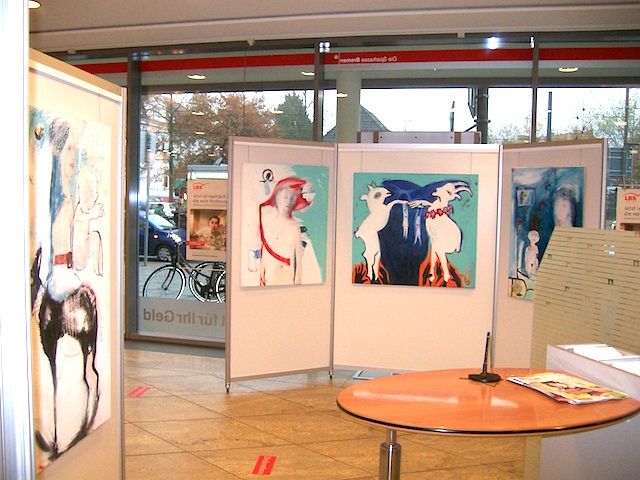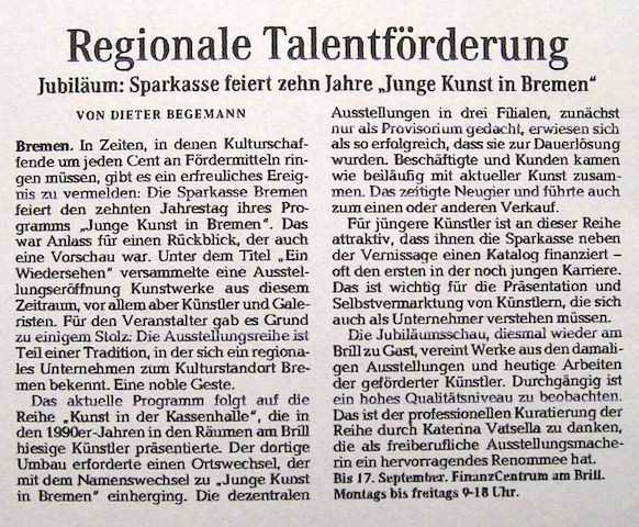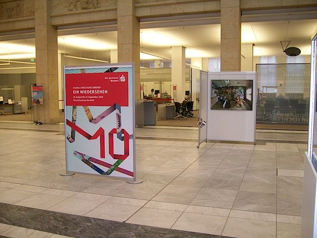 Bereits seit Beginn der 1990er Jahre hat die Sparkasse Bremen darüber hinaus knapp 50 Künstler unter dem Titel ›Kunst in der Kassenhalle‹ mit Ausstellungen und Katalogen gefördert, damals noch mit Doppelausstellungen von Werken der Malerei und Skulptur. Aktuelle Skulpturen und Objekte von Kunstschaffenden, die in den 1990er Jahren in der Sparkasse ausgestellt haben, ergänzen die Präsentation und fungieren als Bindeglied zwischen diesen beiden Etappen der Kunstförderung.