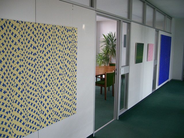 Punkte, Kreise und Kreissegmente, schmale und breite Streifen, aber auch textile Motive bilden in ihren Bildern gleichmäßige Muster, deren Einförmigkeit vom unregelmäßigen Rhythmus der Falten gestört wird. Manchmal dominiert das Muster, manchmal der farbige Hintergrund.