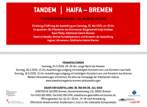 Die Ausstellung in Bremen fand von Mai bis Juli 2019 statt. Dieselben Künstlerinnen und Künstler haben von Mitte November 2019 bis Anfang Januar 2020 in Haifa gemeinsam ausgestellt. Die Tandems sind die gleichen geblieben, es wurden nur andere Werke ausgestellt und zwar von Daniela Borchard-Ratner, Nir Dvorai, Doron Elia, Soledad Har Sheleg, Liav Mizrahi, David Oppenheim, Miriam Sharon und Netalie Zohar aus Haifa und Pia Pollmanns, Edeltraut Rath, Piotr Rambowski, Anja Fußbach, Norbert Bauer, Joachim Pohlenk, Tilman Rothermel und Elianna Renner aus Bremen.