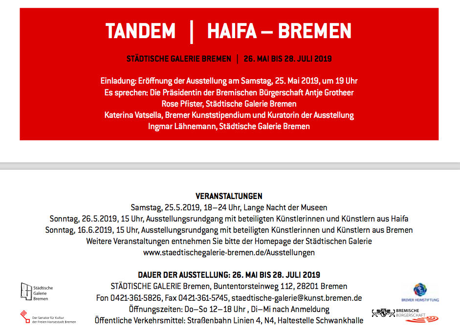 Die Ausstellung in Bremen fand von Mai bis Juli 2019 statt. Dieselben Künstlerinnen und Künstler haben von Mitte November 2019 bis Anfang Januar 2020 in Haifa gemeinsam ausgestellt. Die Tandems sind die gleichen geblieben, es wurden nur andere Werke ausgestellt und zwar von Daniela Borchard-Ratner, Nir Dvorai, Doron Elia, Soledad Har Sheleg, Liav Mizrahi, David Oppenheim, Miriam Sharon und Netalie Zohar aus Haifa und Pia Pollmanns, Edeltraut Rath, Piotr Rambowski, Anja Fußbach, Norbert Bauer, Joachim Pohlenk, Tilman Rothermel und Elianna Renner aus Bremen.